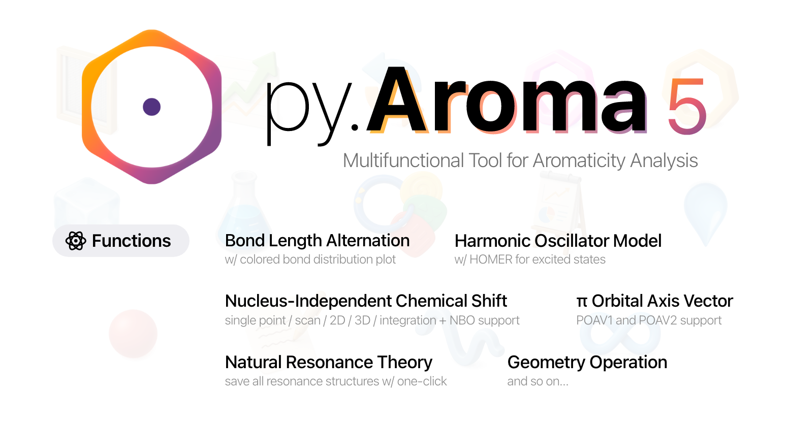 py.Aroma 5 is a free, open-source program toolkit for aromaticity analysis. It supports BLA, HOMA, HOMER, POAV, NICS (Single point, 2D, 3D, XY-Scan, Integrated NICS), dissected NICS (i.e., NICSπ via NBO program), and natural resonance theory (NRT) analysis. Option functionalities for plotting NMR spectrum, computational supporting information generator, and geometry operations have been integrated.